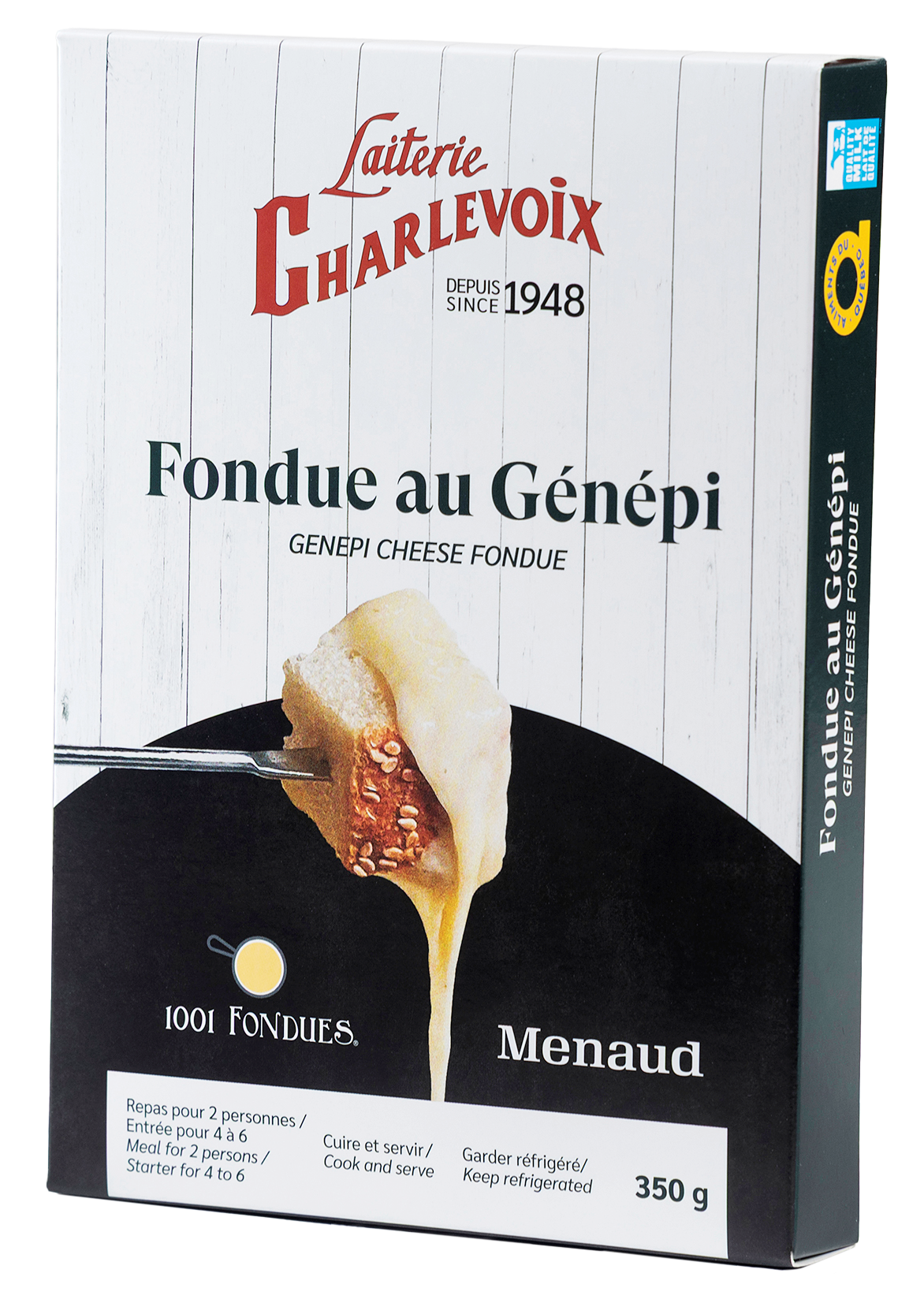 Enjoy an authentic gourmet pleasure born from the meeting of 1001 Fondues’ craftsmanship and that of Distillerie Menaud. This fondue blends Charlevoix cheeses with Génépi distilled from alpine plants. Its herbal, floral and lightly fruity notes create a refined experience, deeply rooted in the Charlevoix terroir.